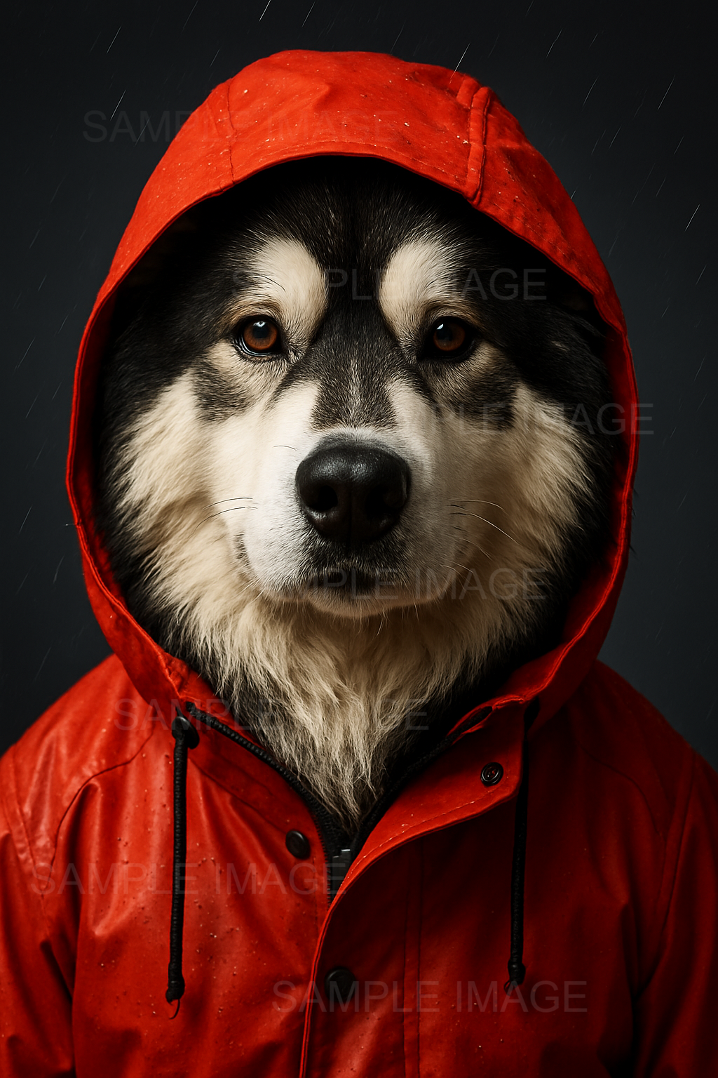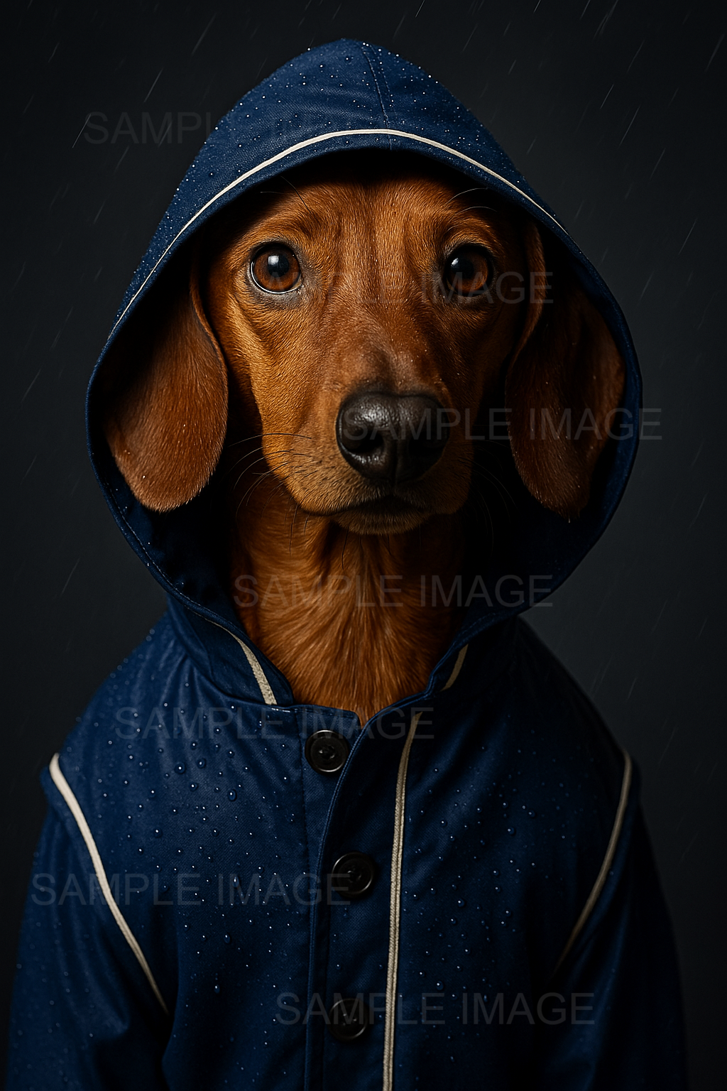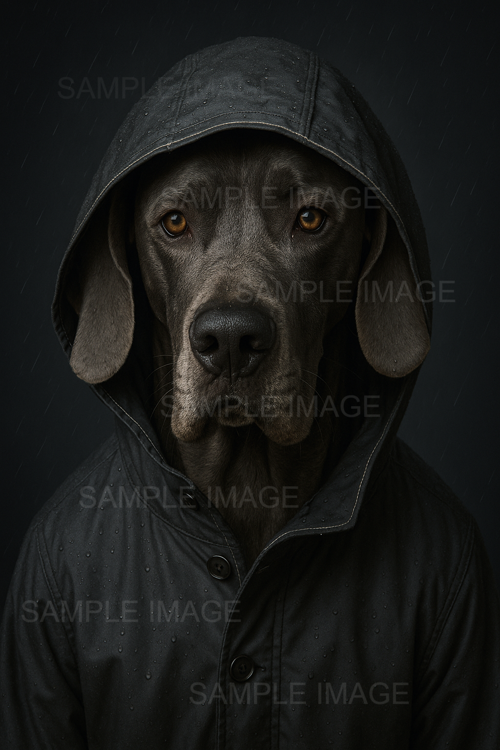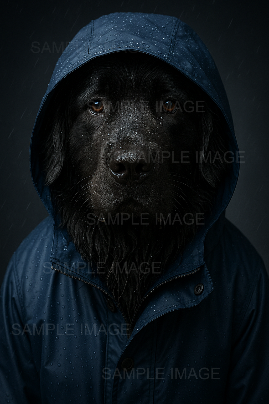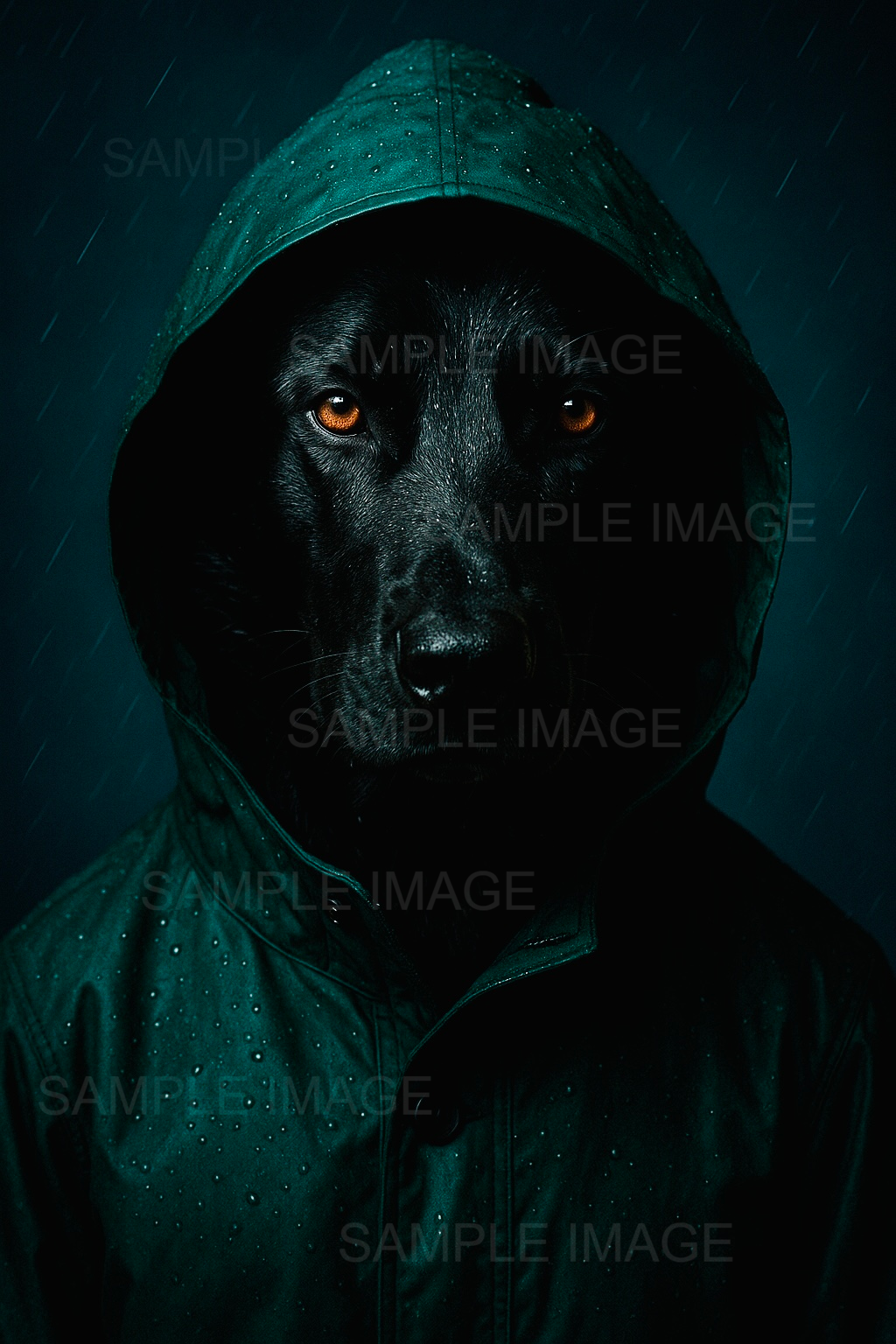Cinematic portraits in the rain. Hoods up, wet fur, dramatic light.
