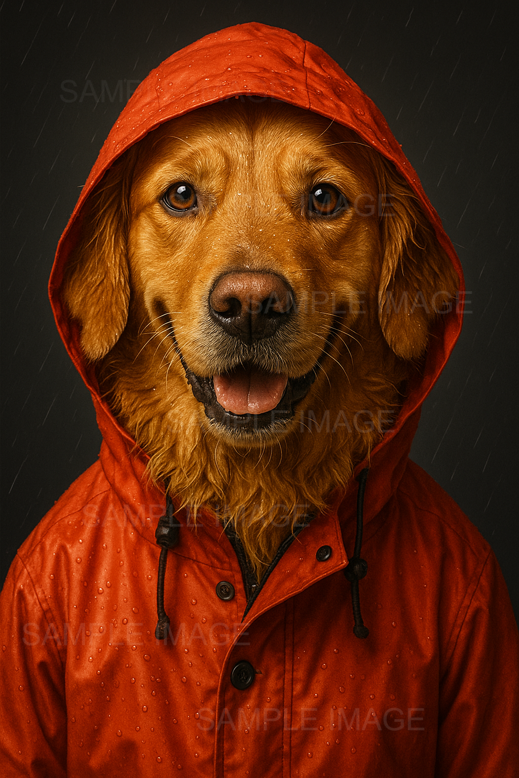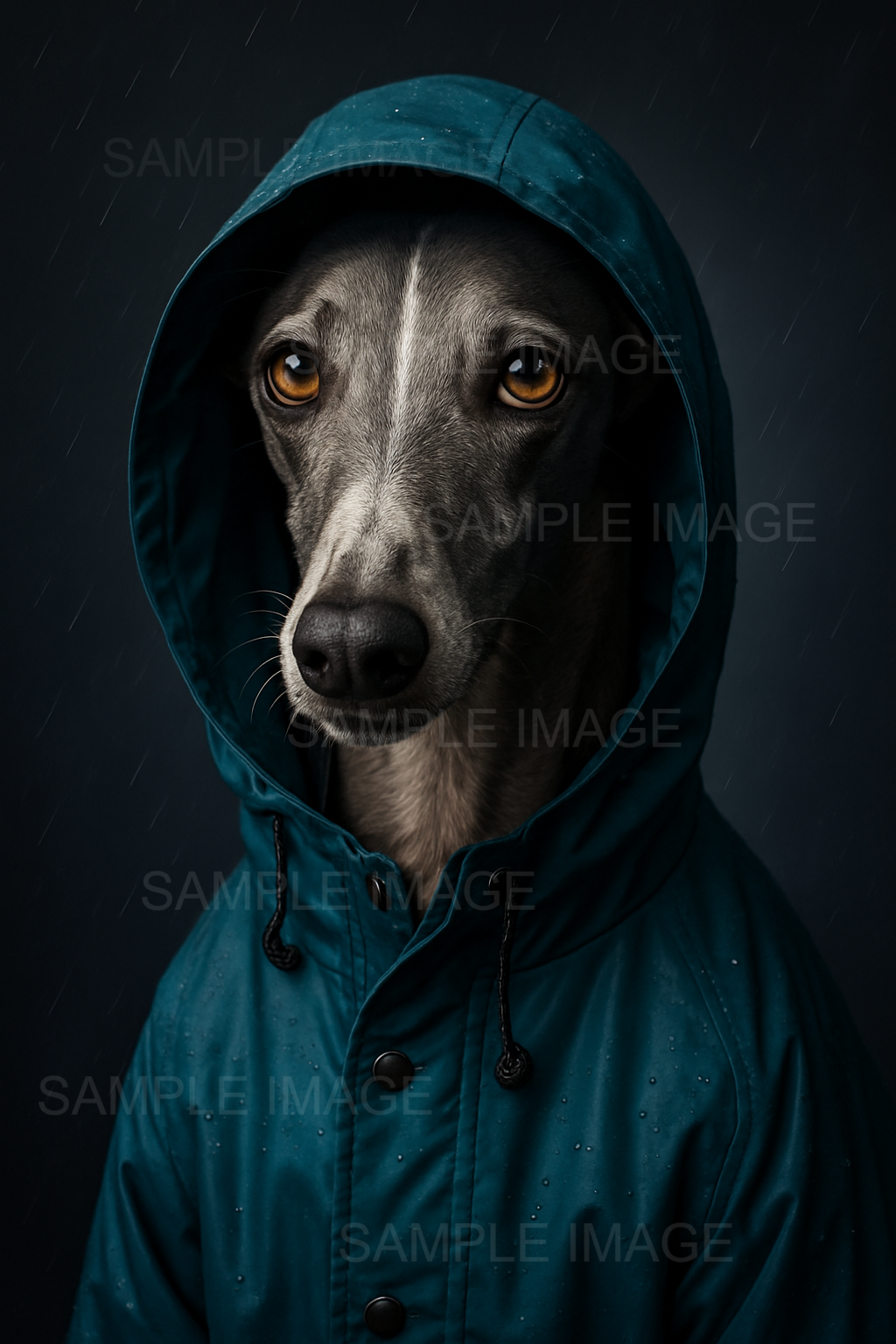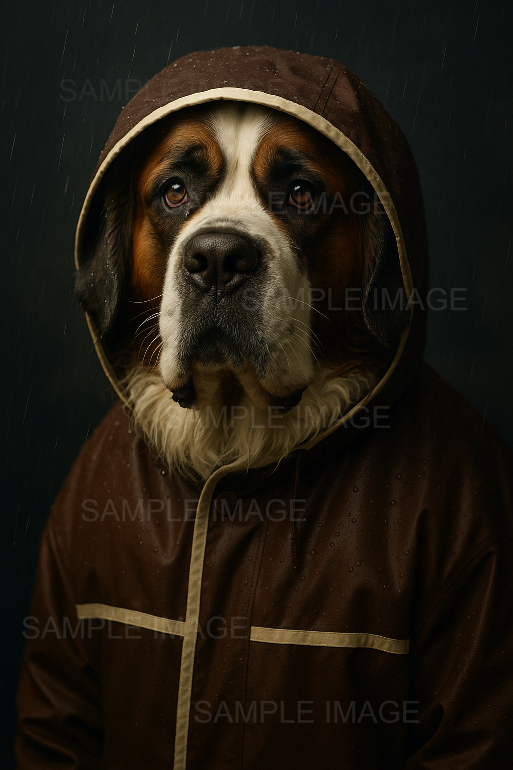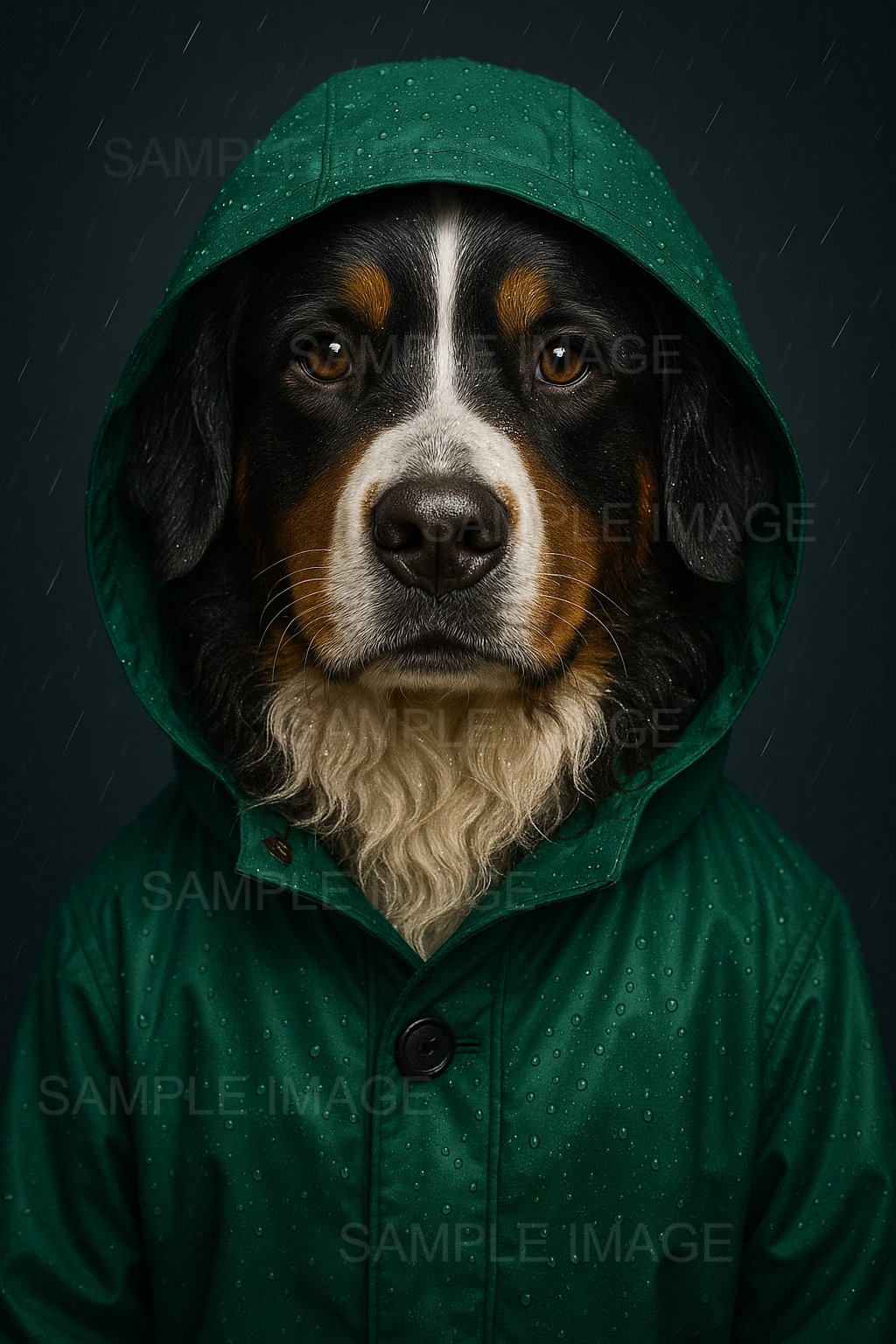 Cinematic portraits in the rain. Hoods up, wet fur, dramatic light.