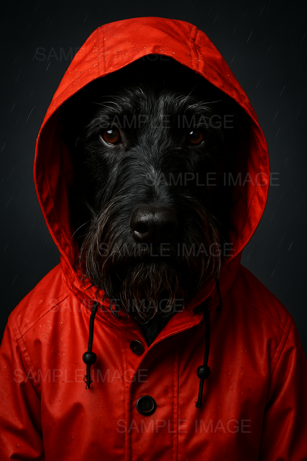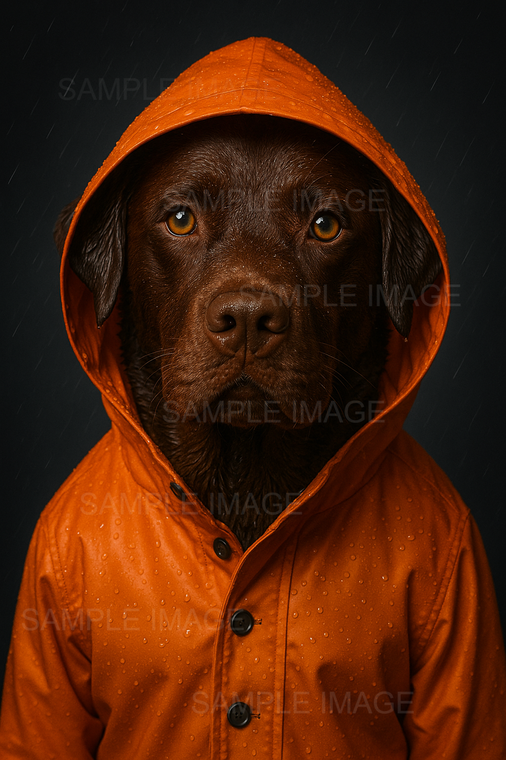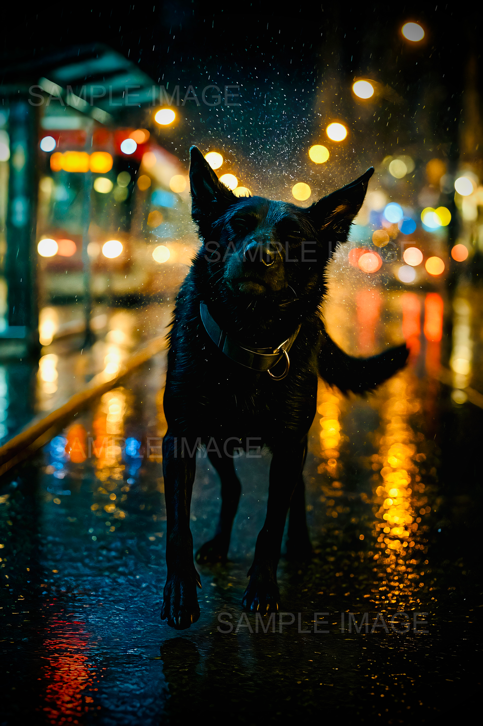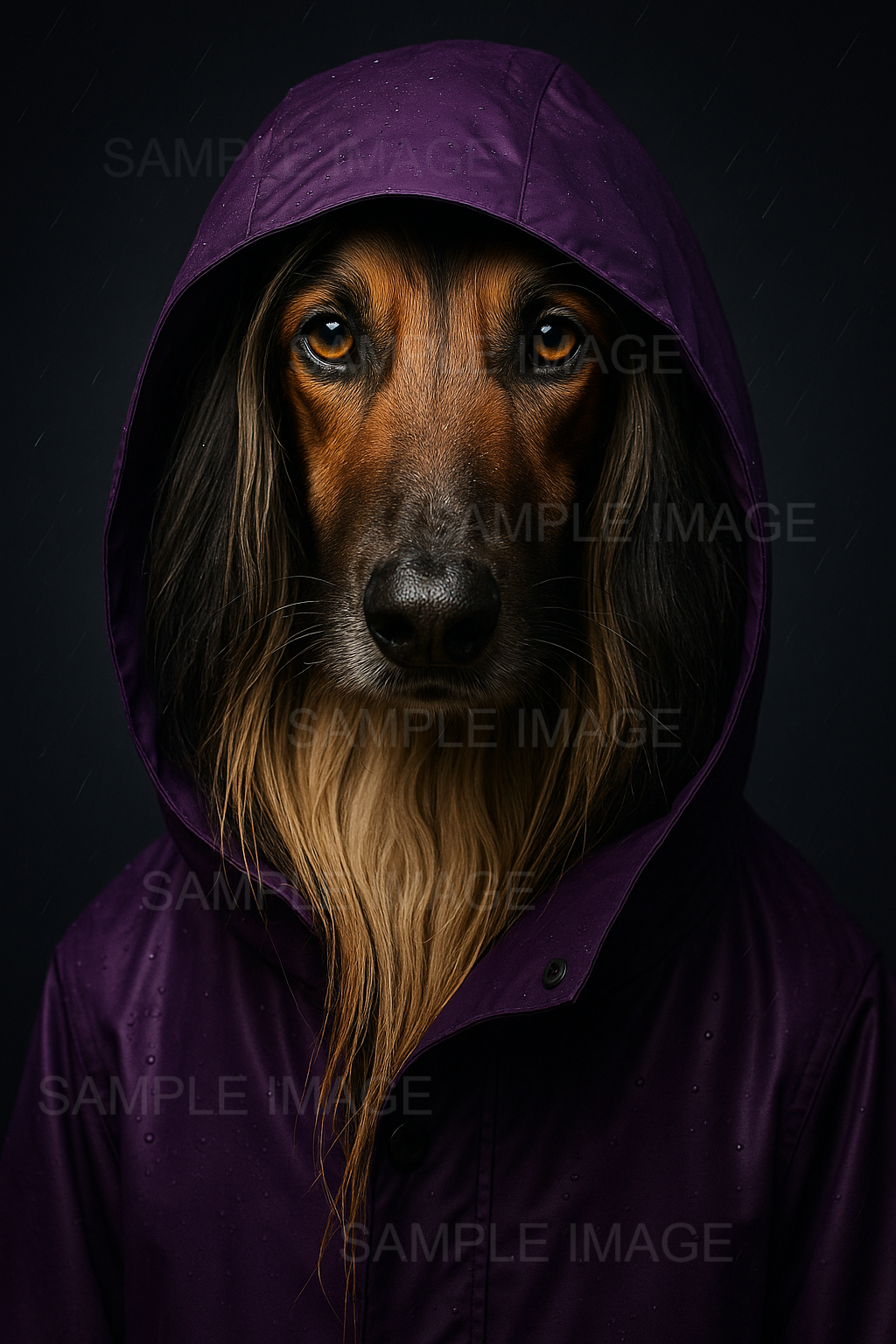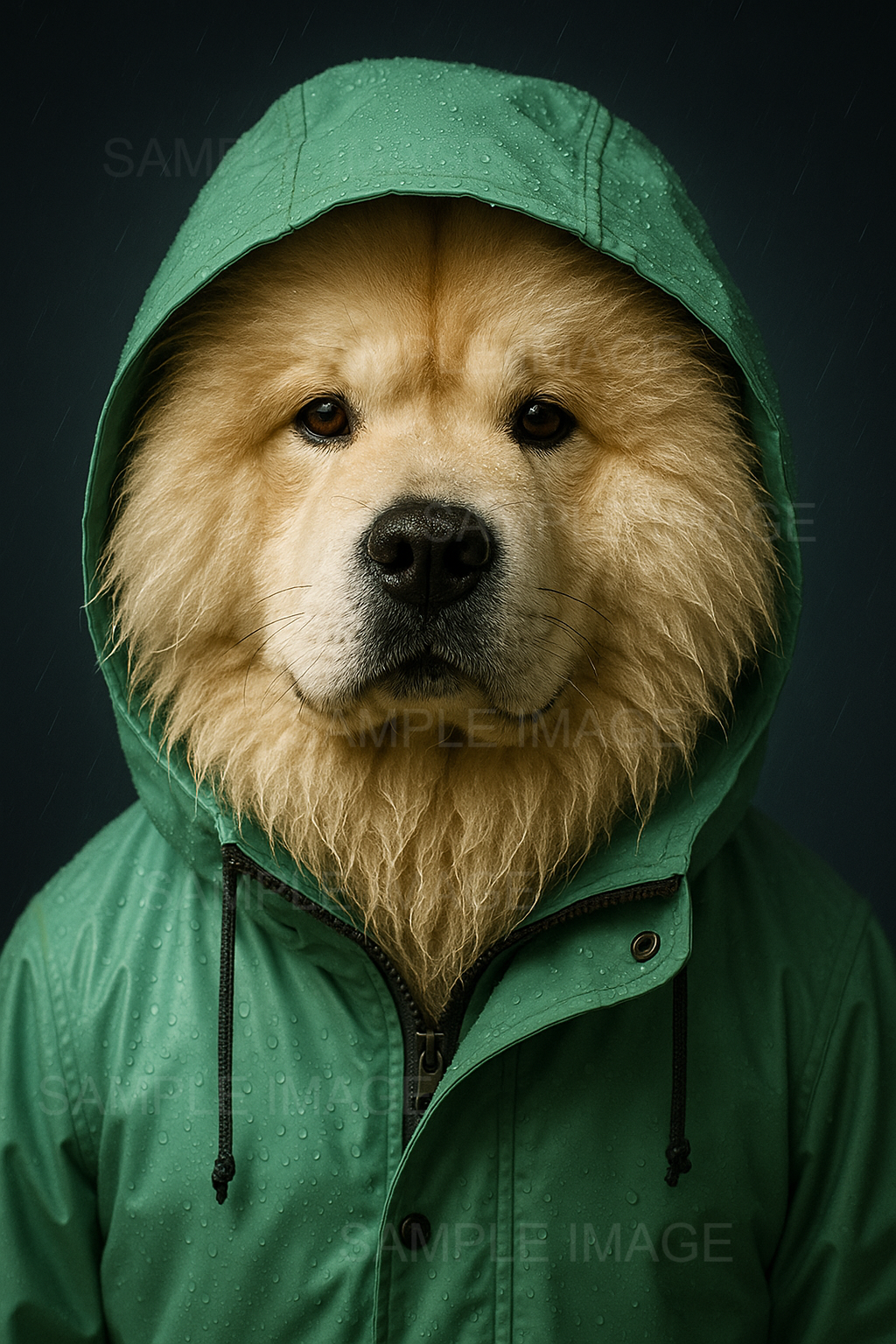 Cinematic portraits in the rain. Hoods up, wet fur, dramatic light.