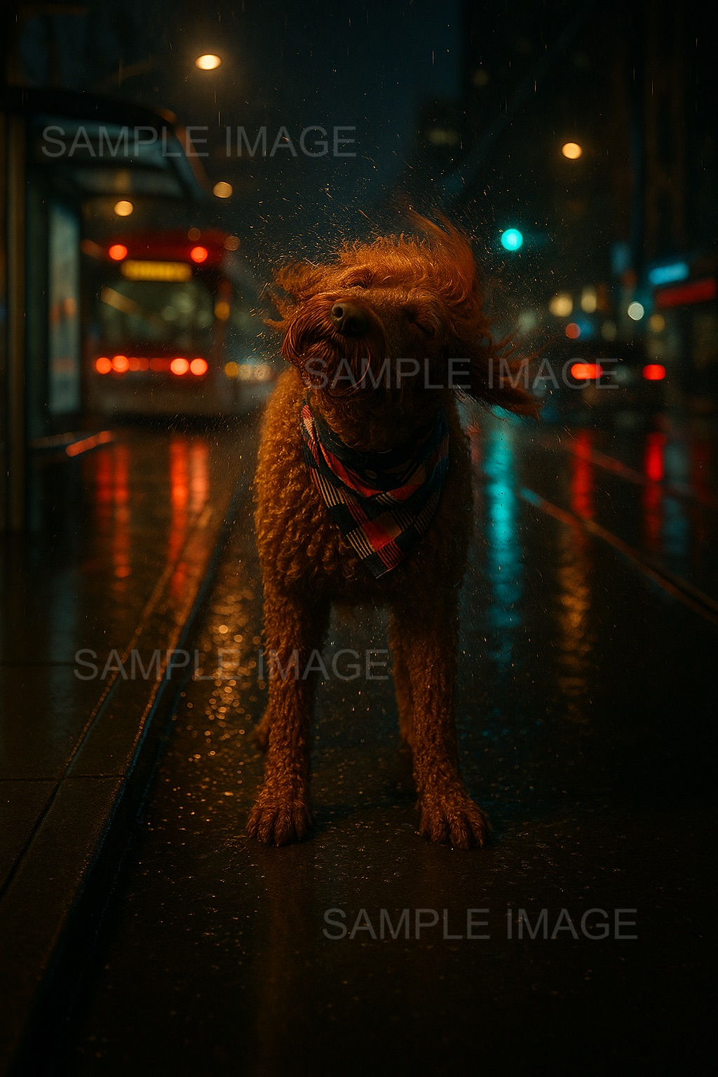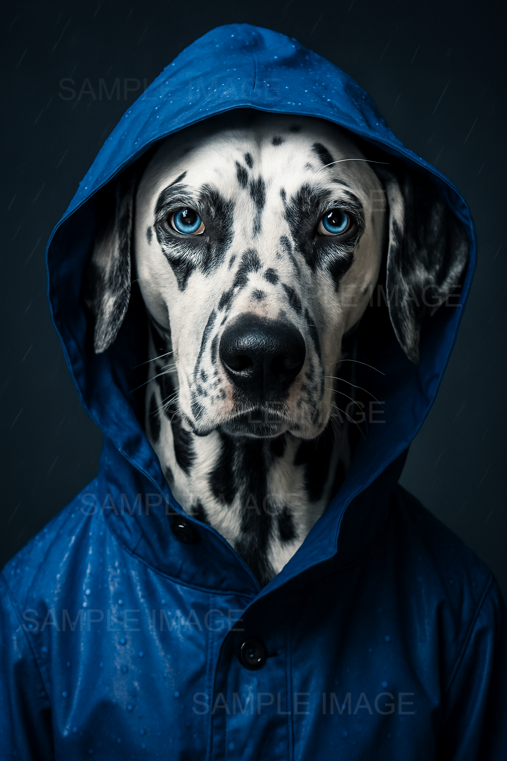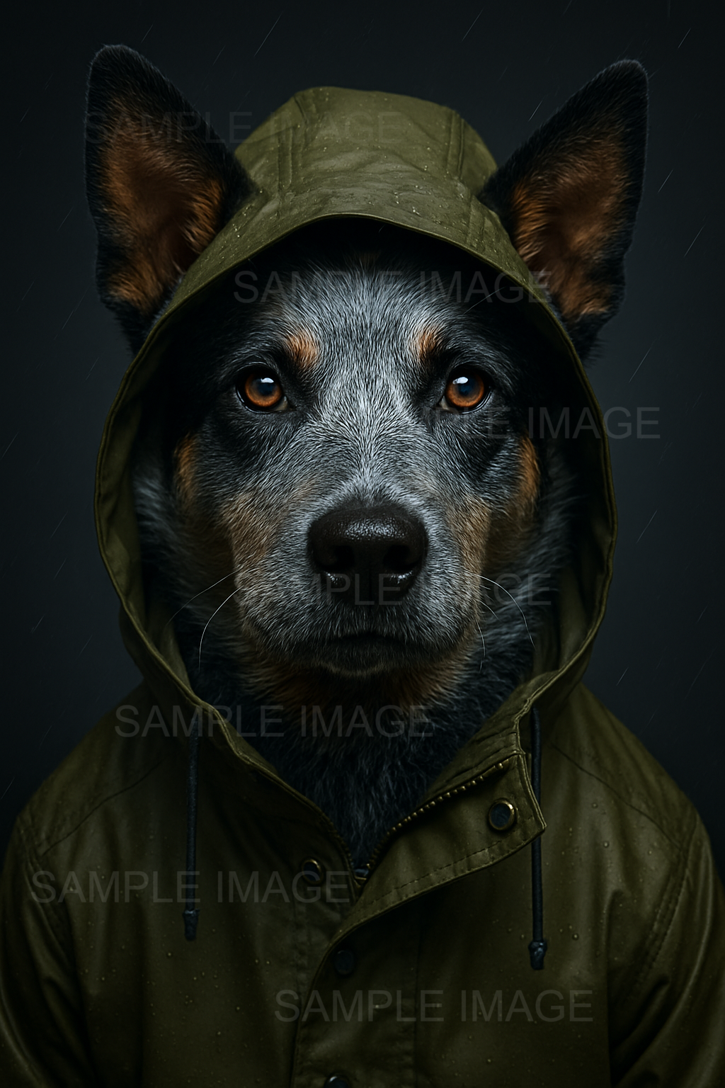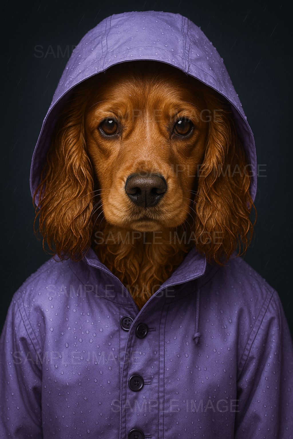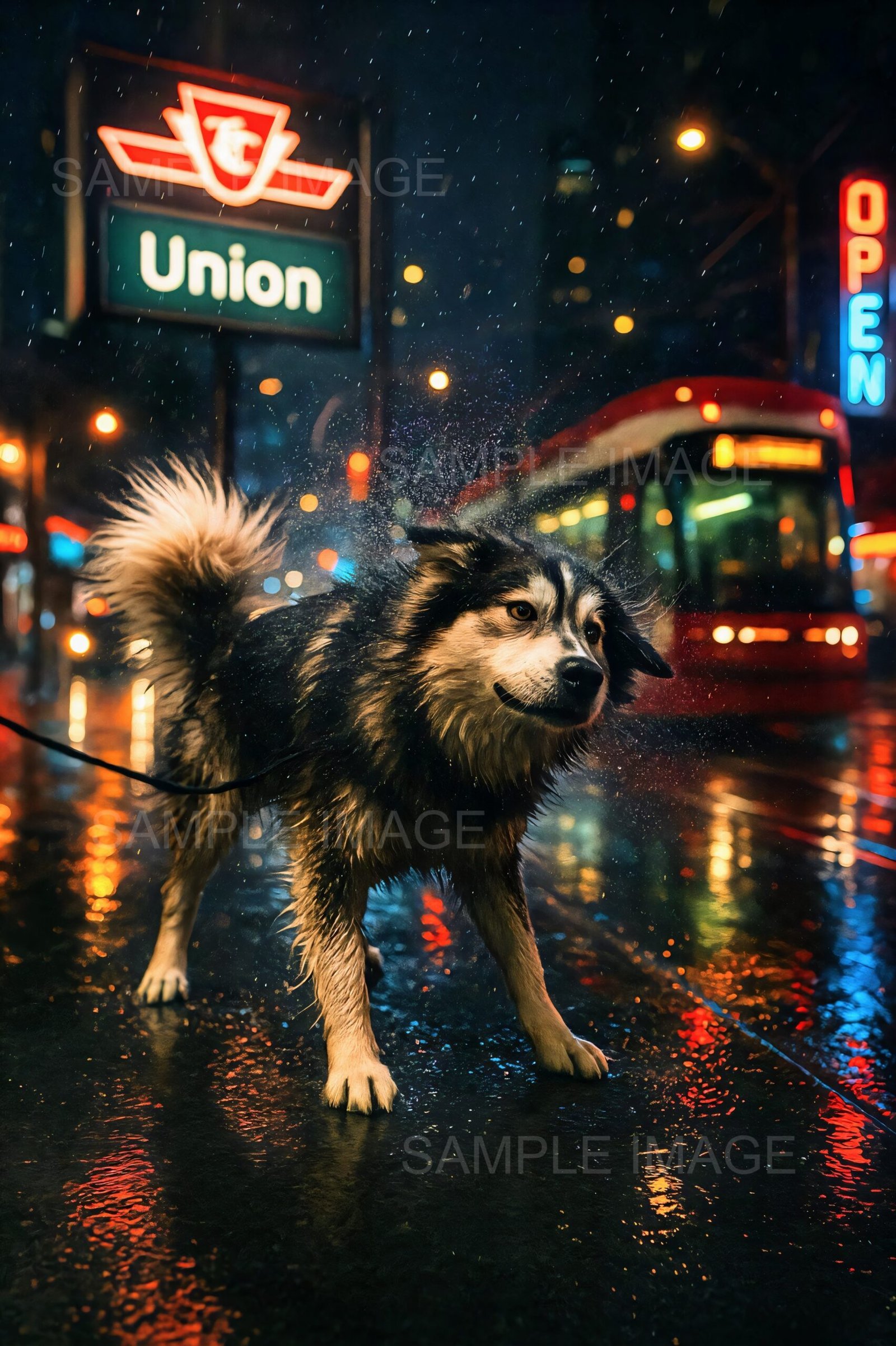 Cinematic portraits in the rain. Hoods up, wet fur, dramatic light.