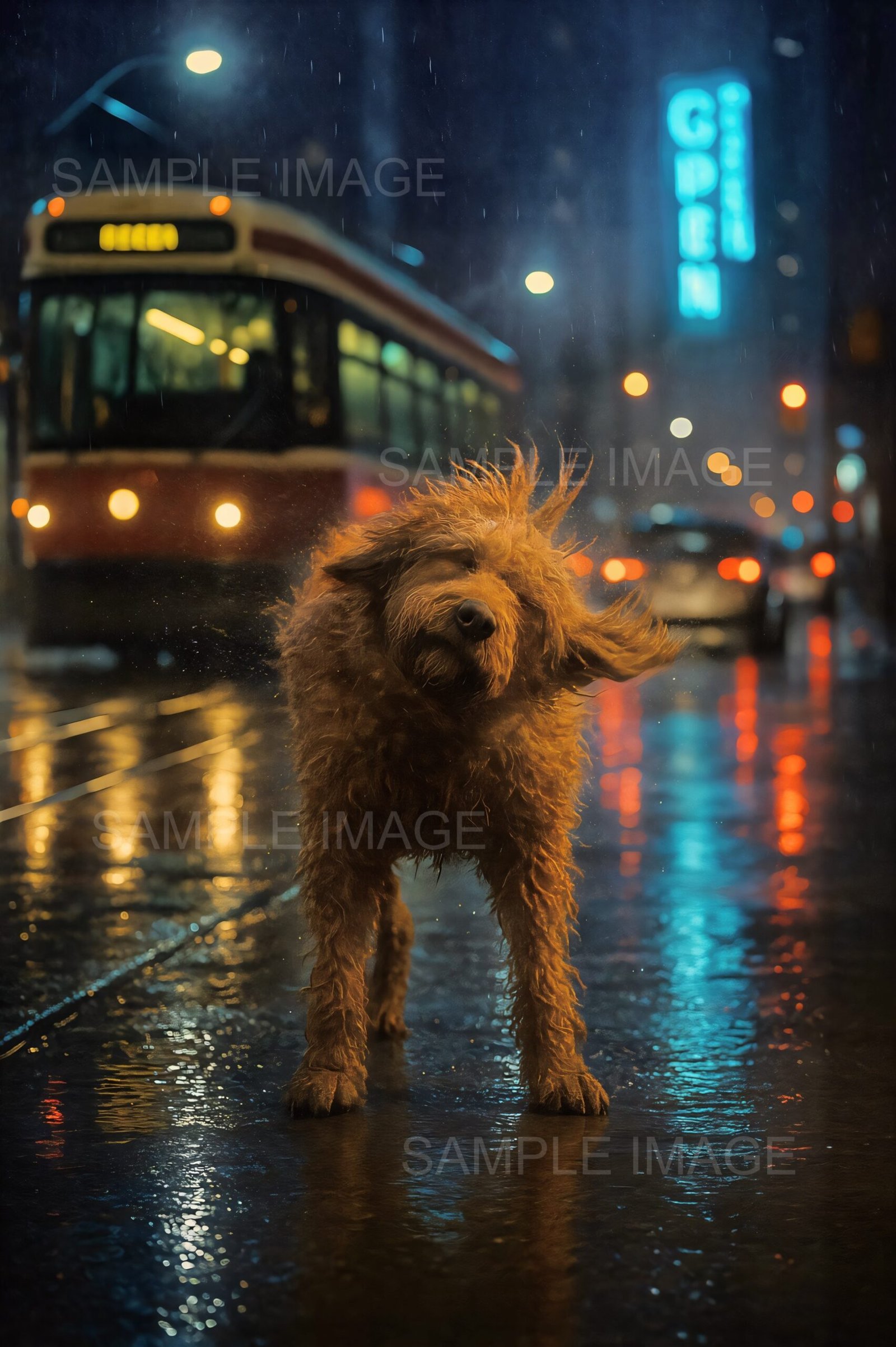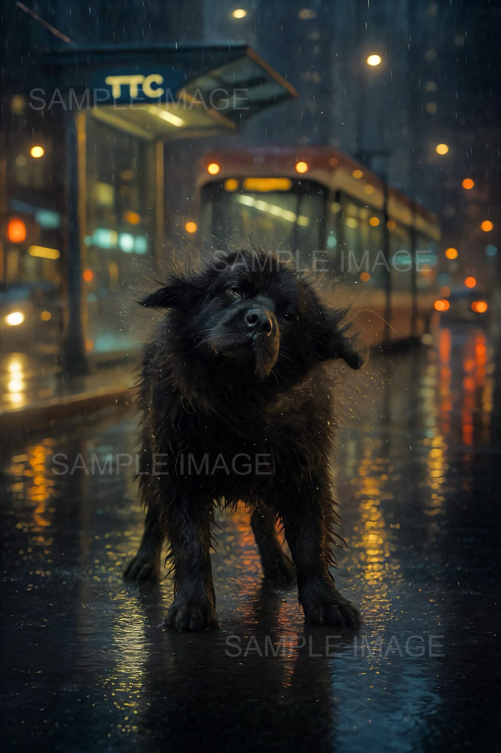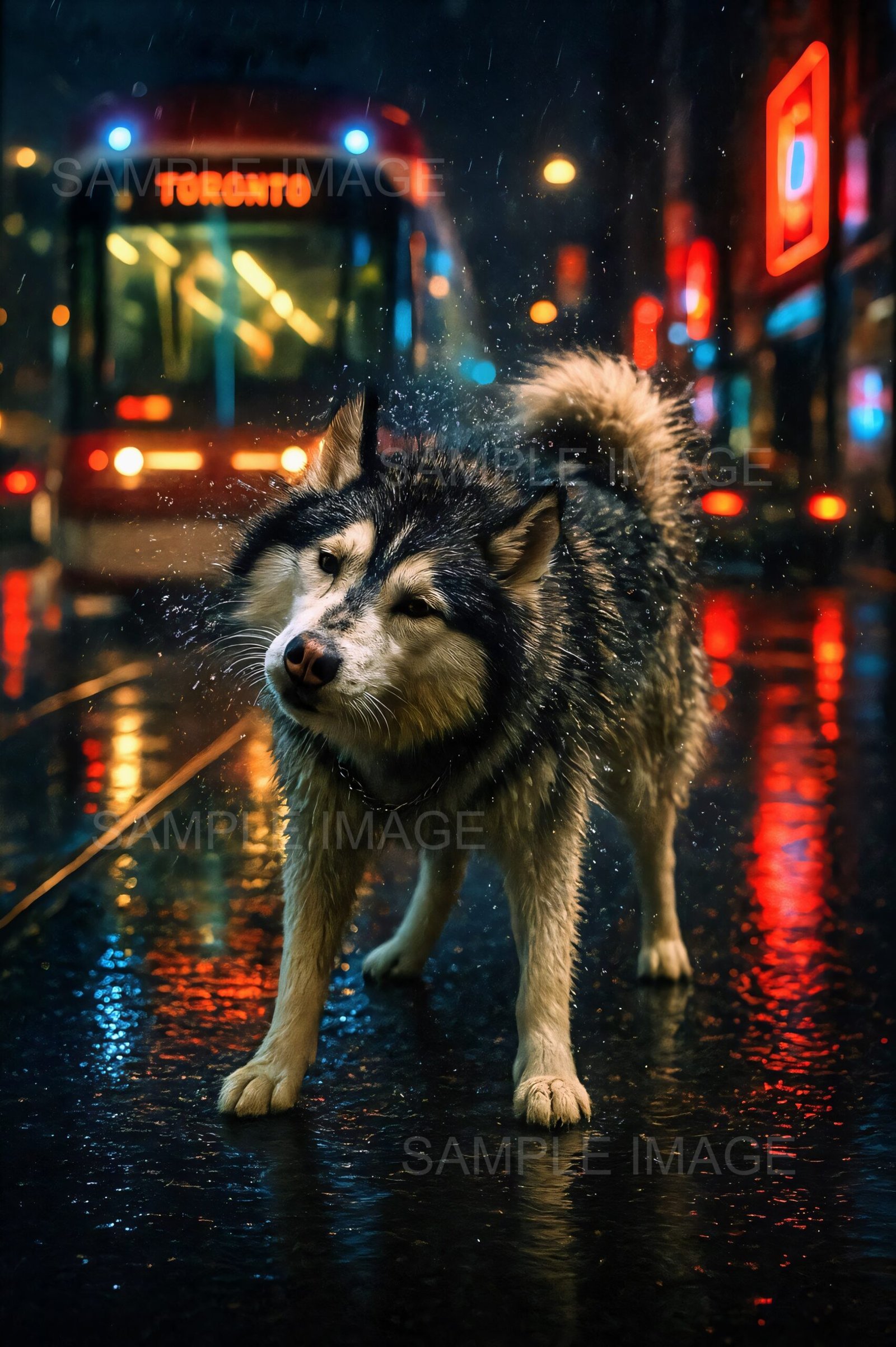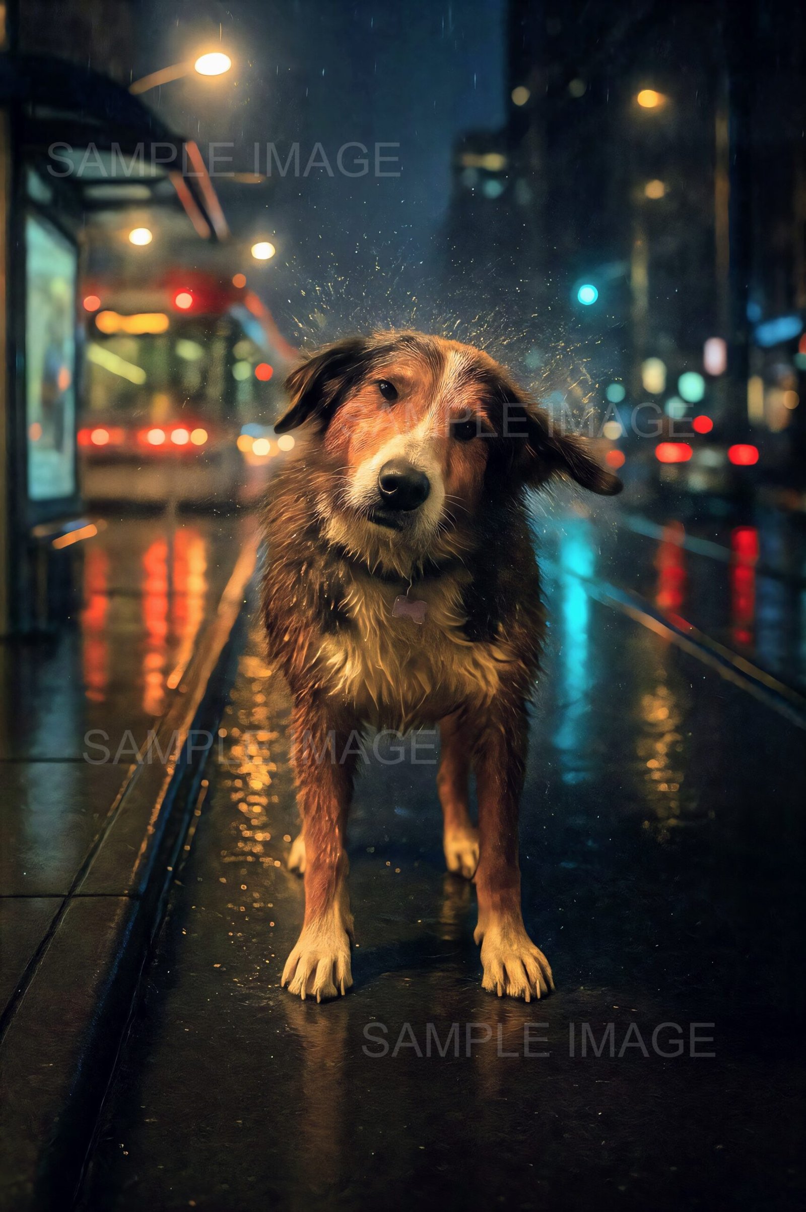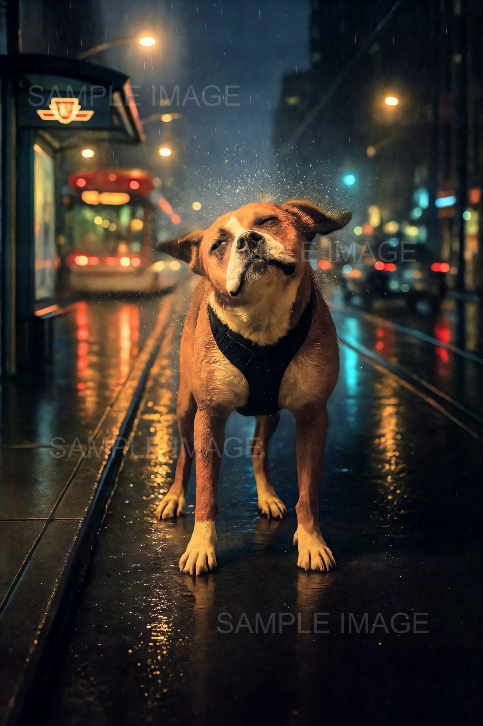 Cinematic portraits in the rain. Hoods up, wet fur, dramatic light.