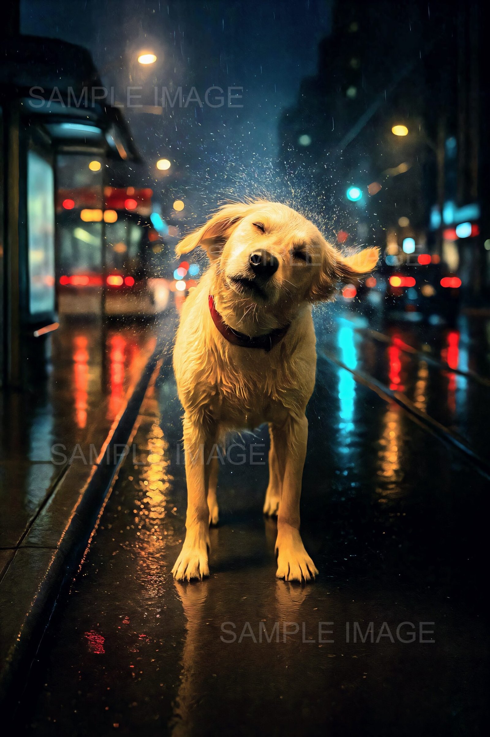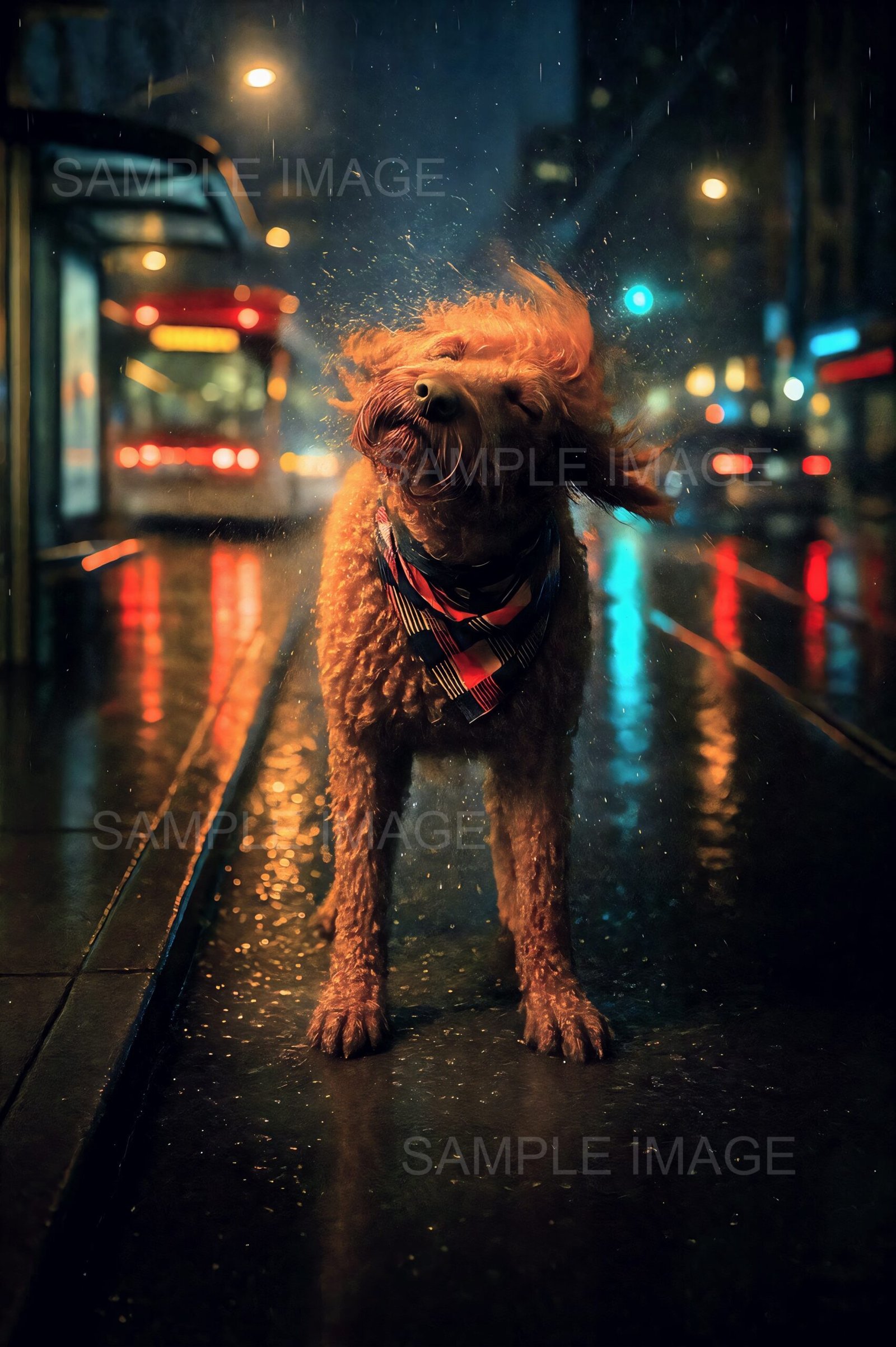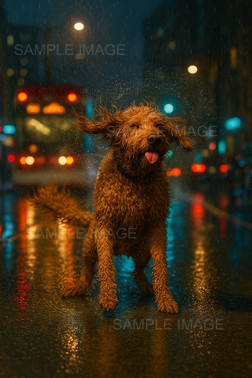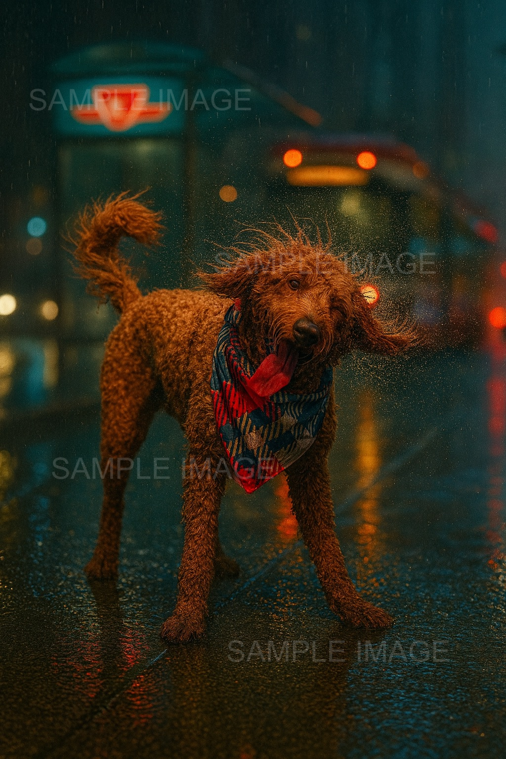 Cinematic portraits in the rain. Hoods up, wet fur, dramatic light.