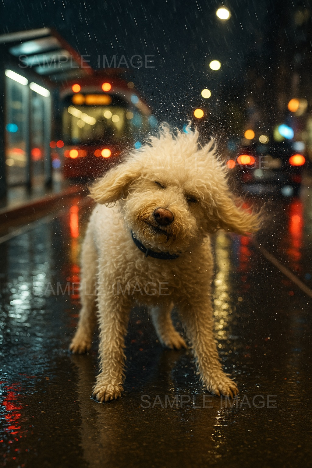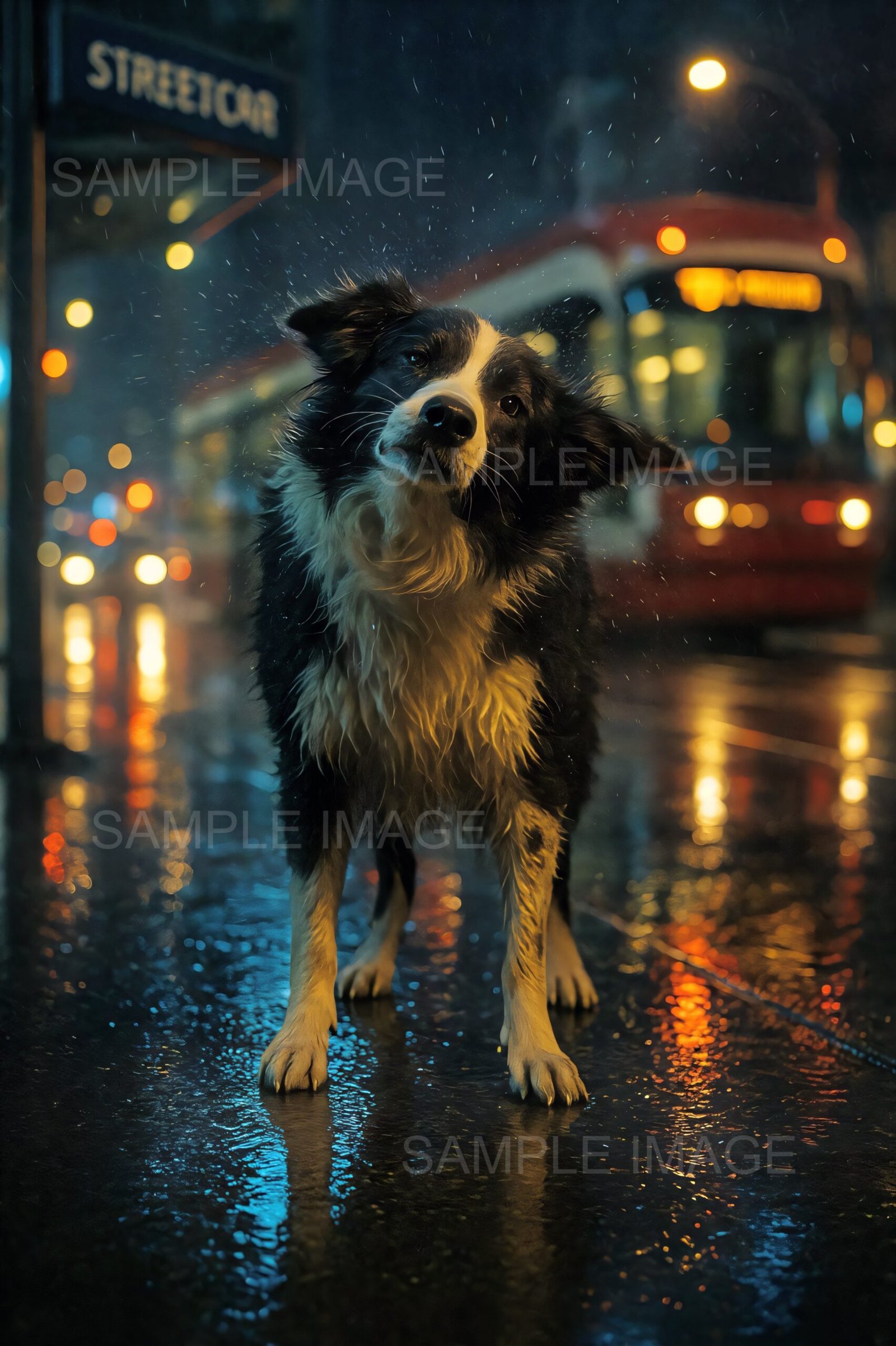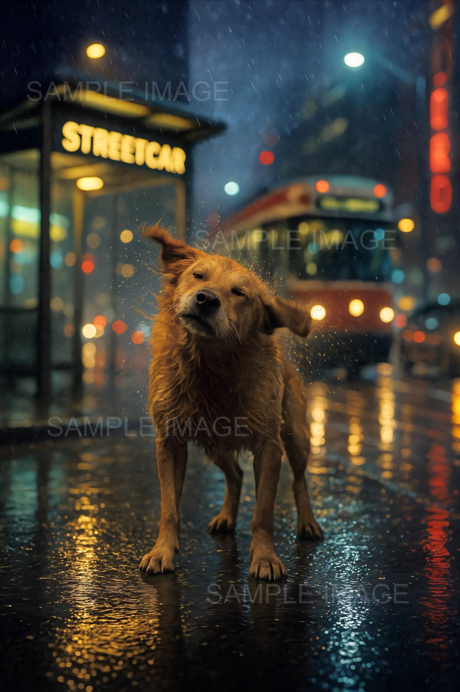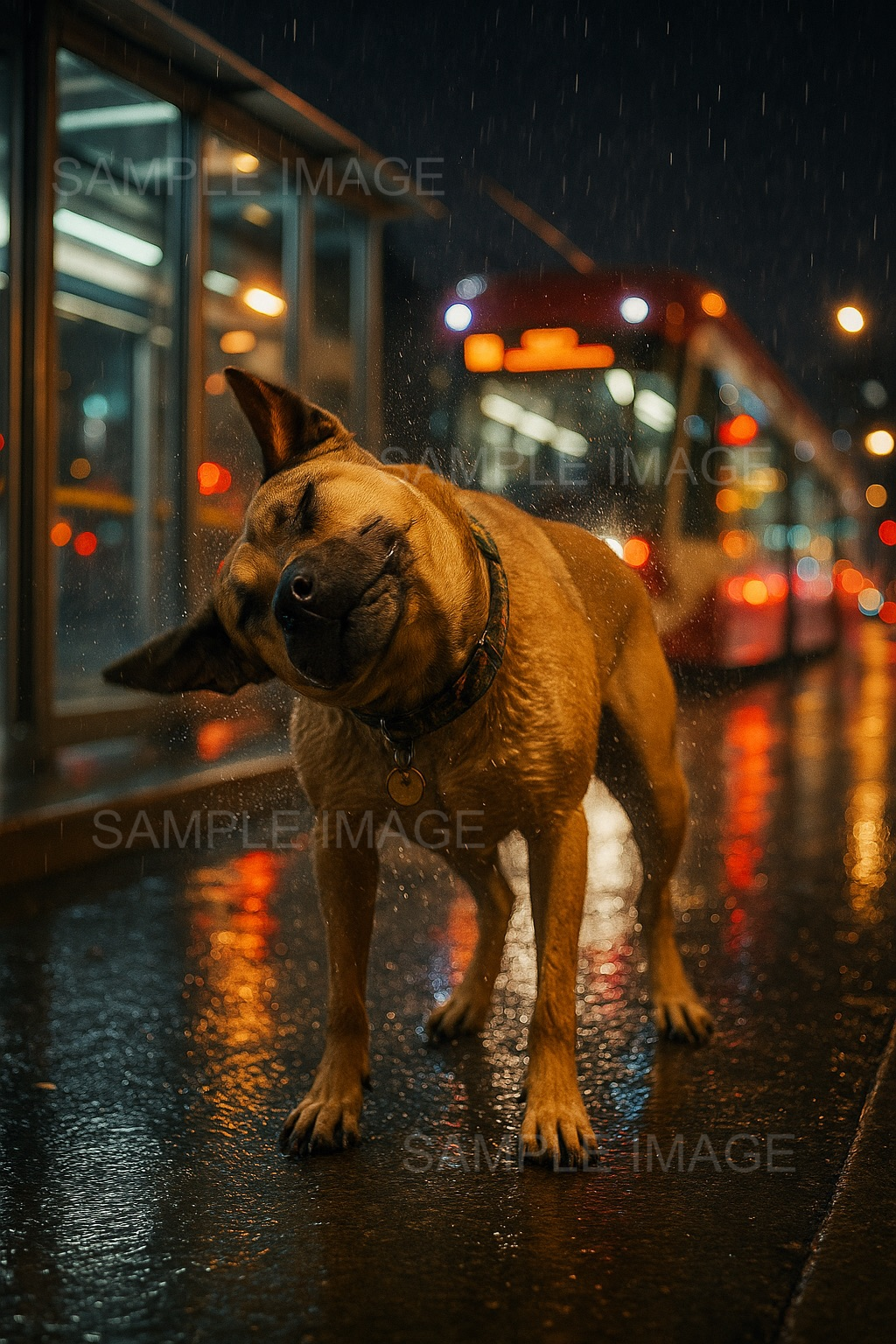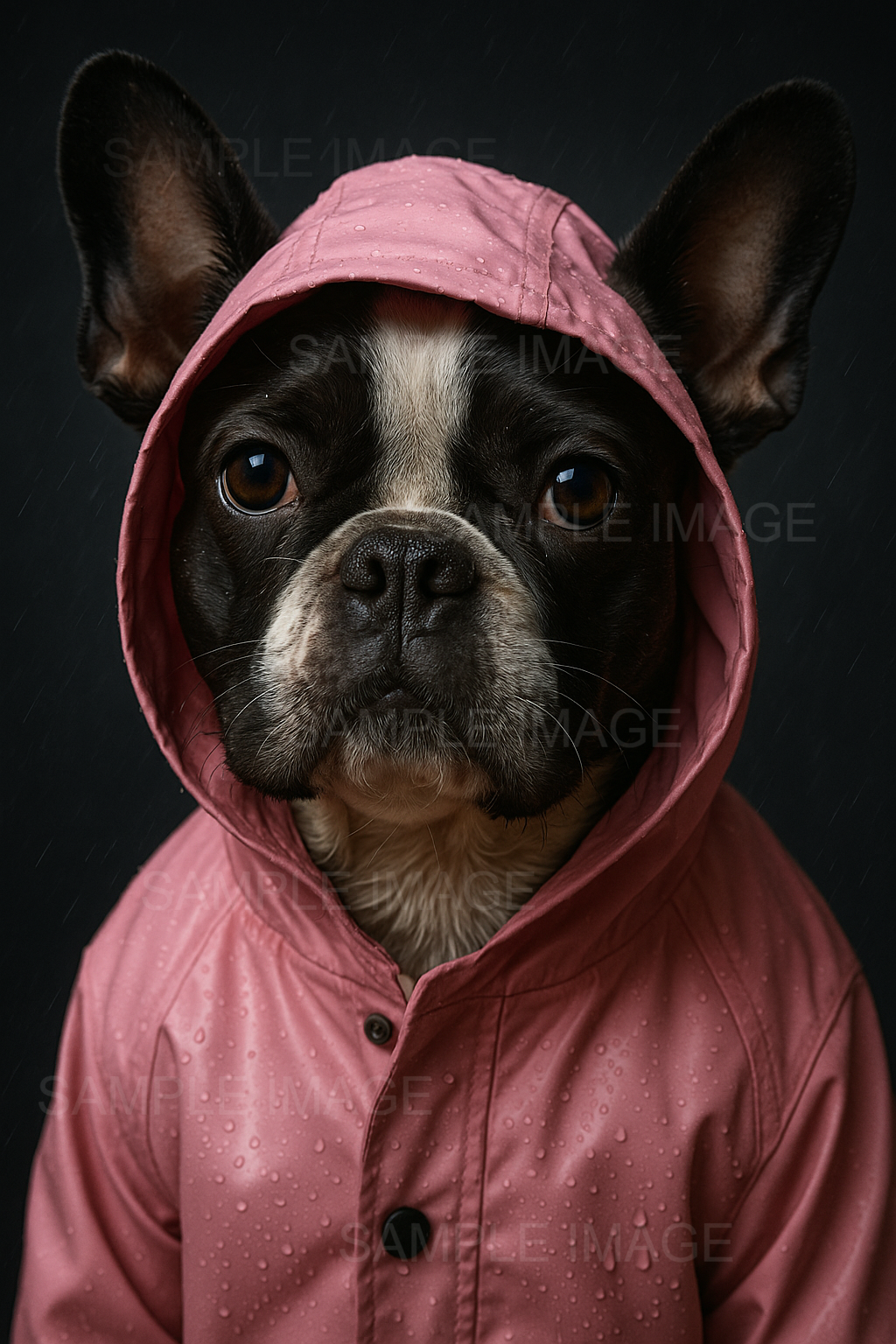 Cinematic portraits in the rain. Hoods up, wet fur, dramatic light.